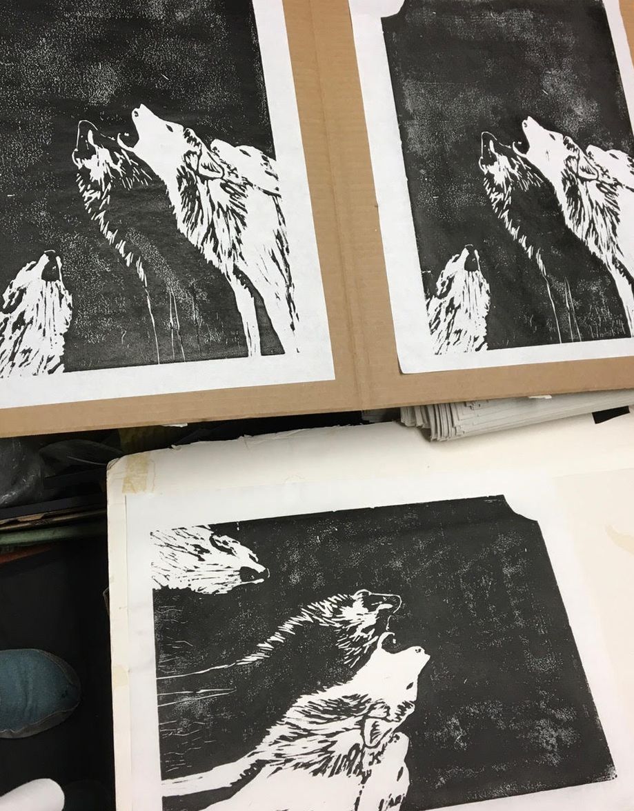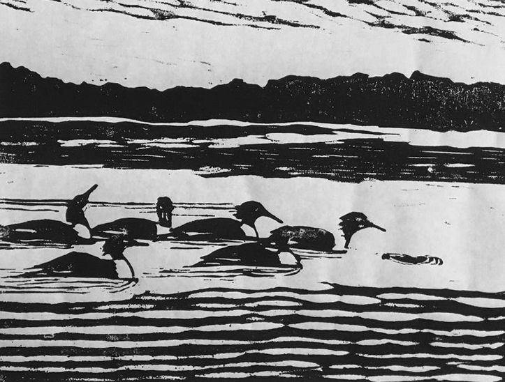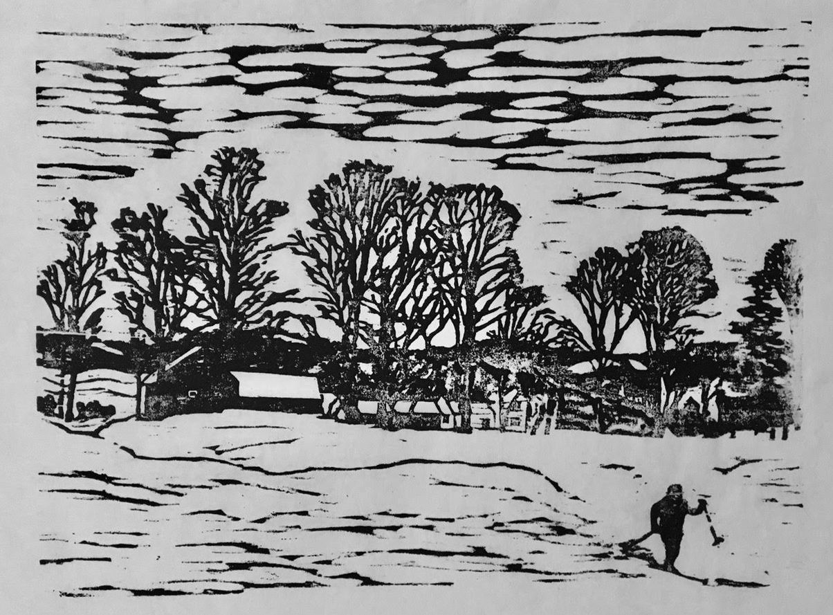 I am drawn to the craft of woodcut printmaking for many reasons... I like the tactile quality of the art, and the energy transmitted from the heart and hand through gouges and knives to wood, and then with ink, to paper, leaving its mark in print. I enjoy the challenge and simplicity of black and white design. I use planks of pine wood, sometimes an effect of sky or water comes from old barn board, which reveals its grain with the help of a wire brush. On the board, I sketch out the design, aware that the final prints will be the reverse of what I have drawn.
